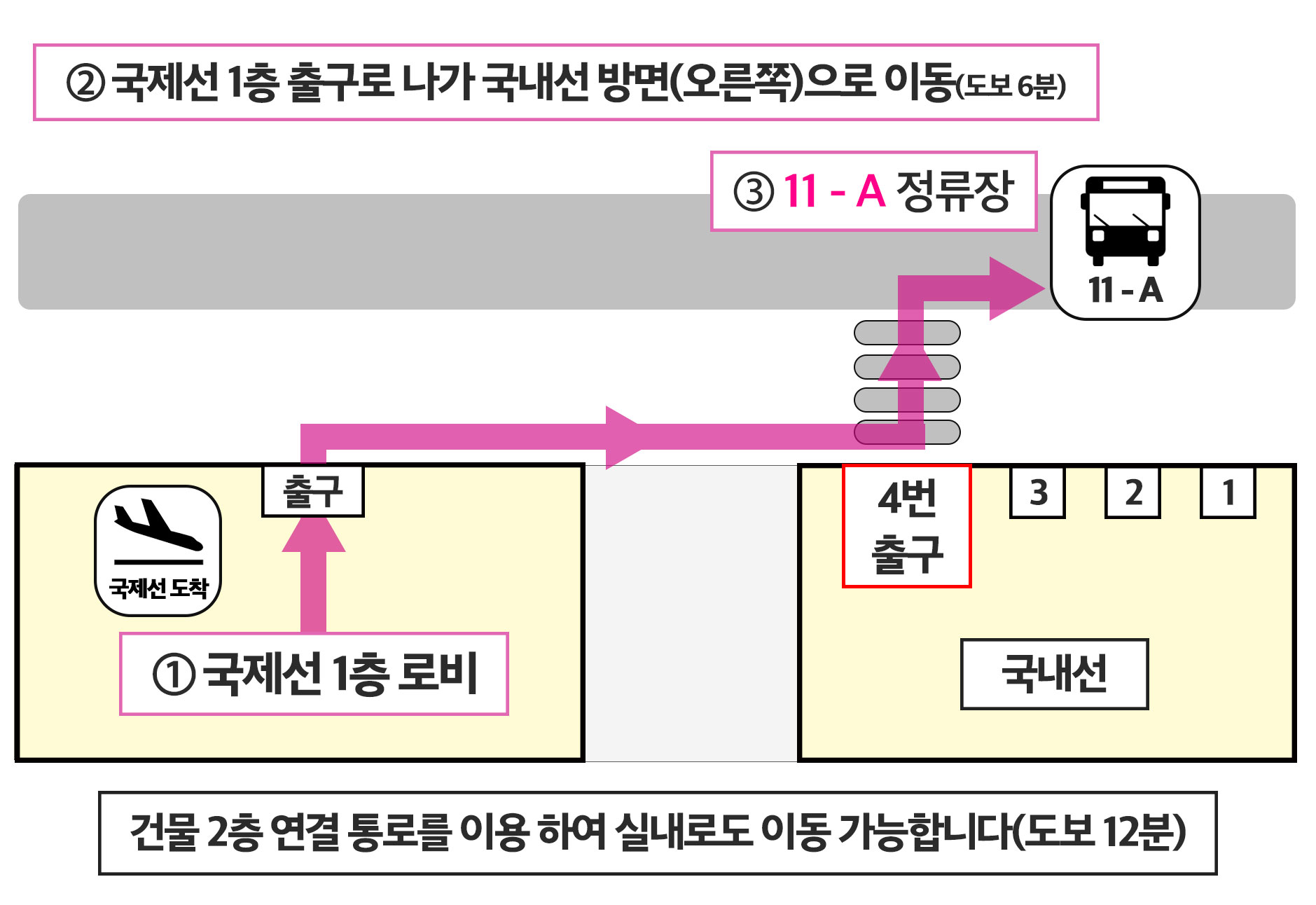 국제선 1층 출구로 나가 국내선 방면으로 약 8분 도보 이동